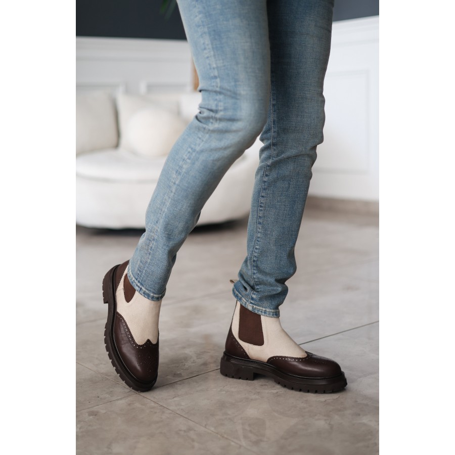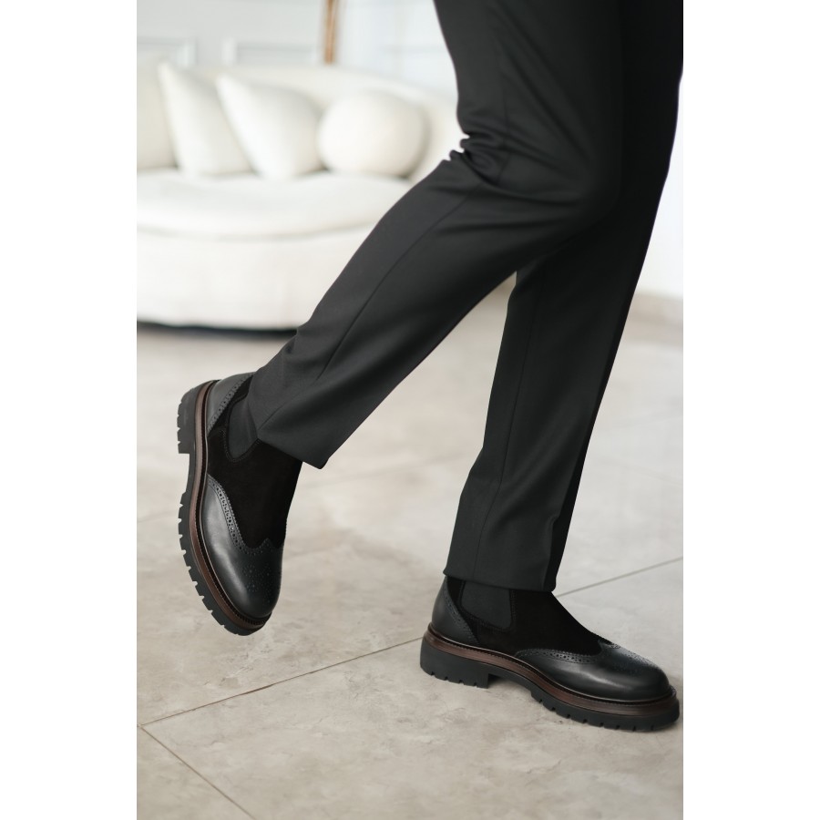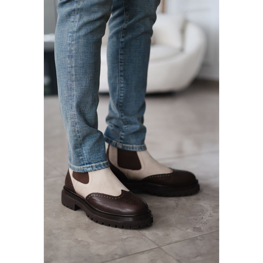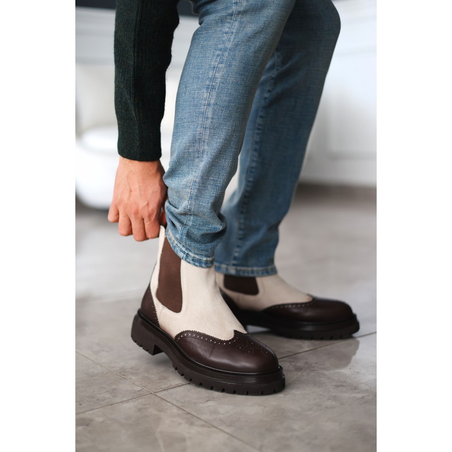 Tarz ve konforu bir arada sunan bu bot modeli, kaliteli süet ve deri kombinasyonu ile dikkat çeker. Brogue dikiş detaylarıyla klasik şıklığı modern bir çizgiyle buluşturur. Kalın ve dayanıklı tabanı sayesinde soğuk havalarda yüksek konfor ve zemin tutuşu sağlar.