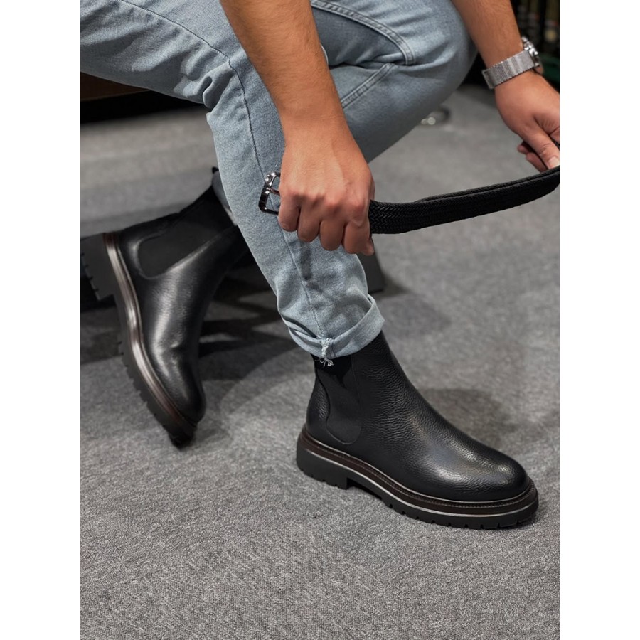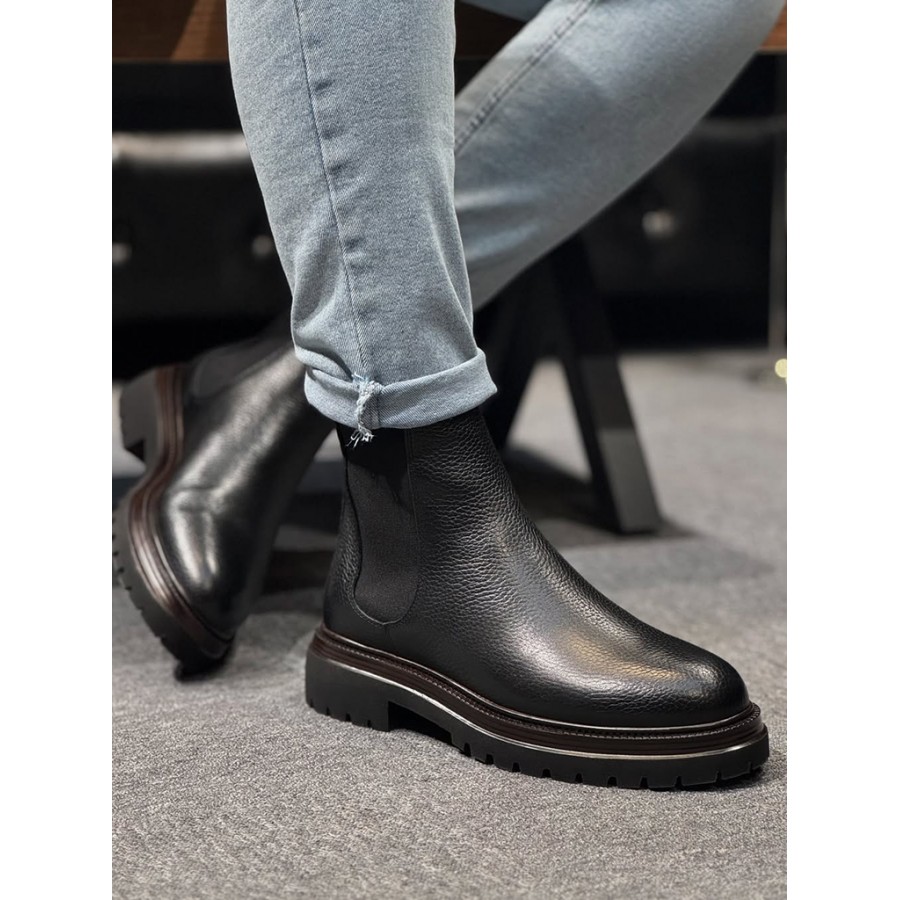 Üst Malzeme: Siyah hakiki deri, uzun ömürlü kullanım ve doğal görünüm sağlar. Dayanıklı yapısı ile soğuk ve nemli havalara karşı koruma sunar.
