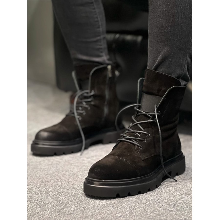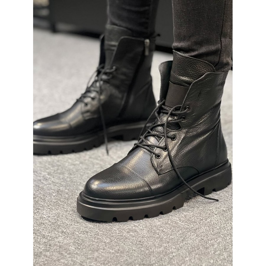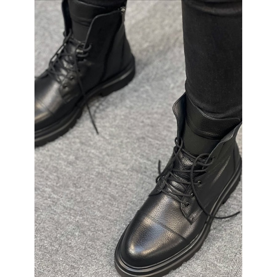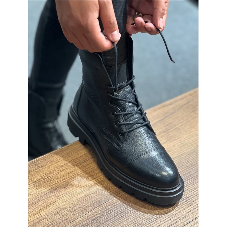 Erkek Siyah Hakiki Deri Bağcıklı Postal Bot – Kalın Taban, soğuk havalarda hem tarzınızı tamamlayan hem de güvenli, konforlu bir kullanım sunan mükemmel bir tercihtir.