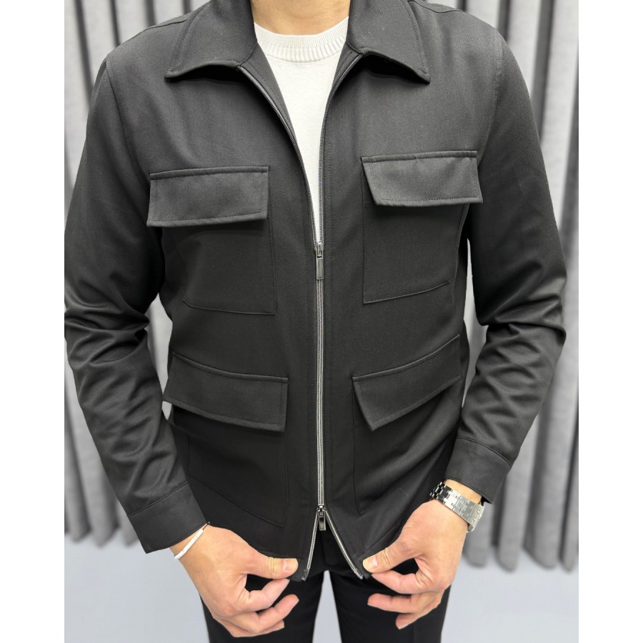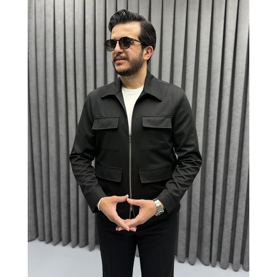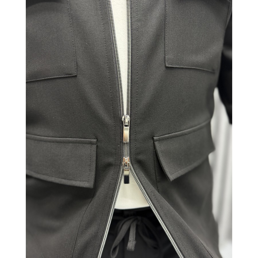 Çift fermuarlı, dik yaka modern ceket tasarımı