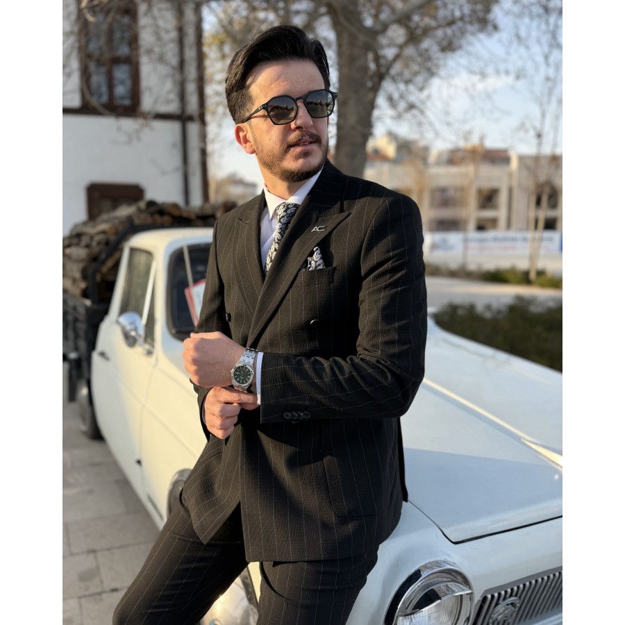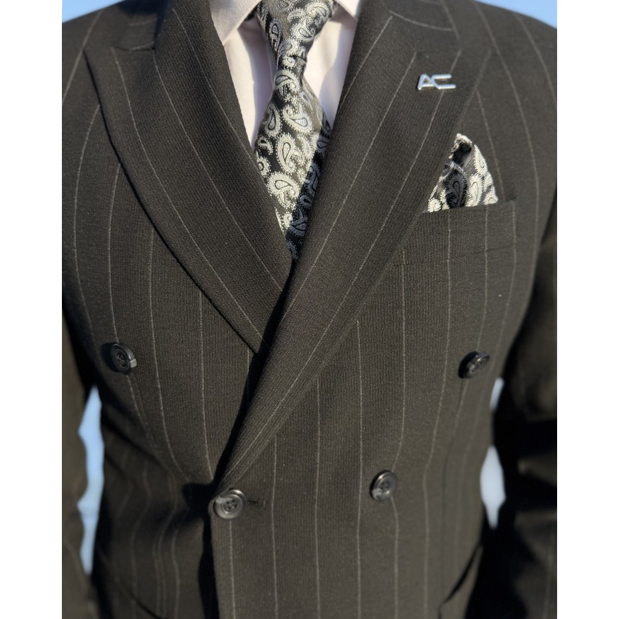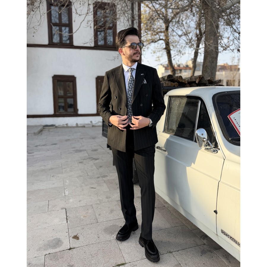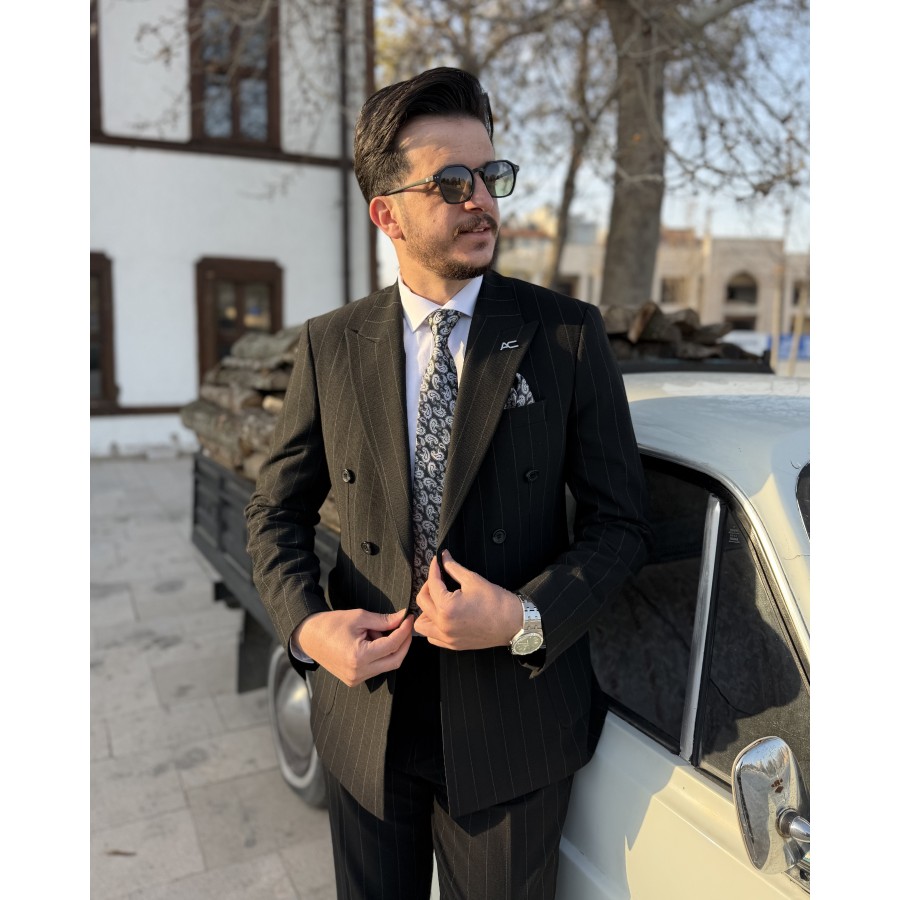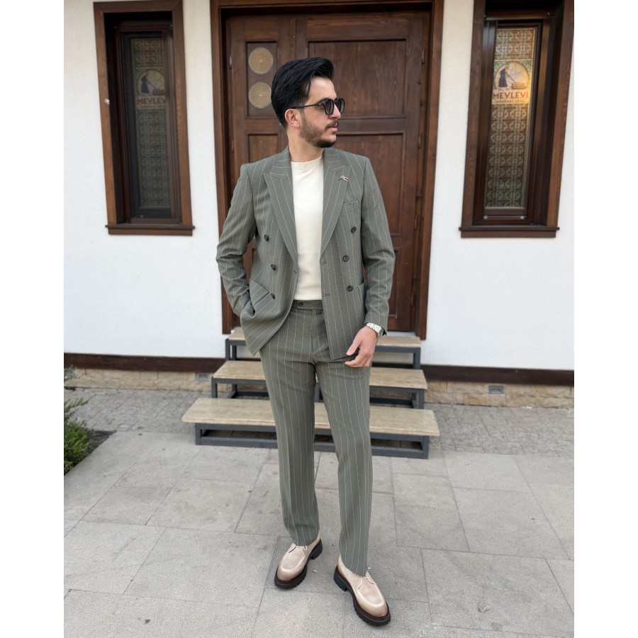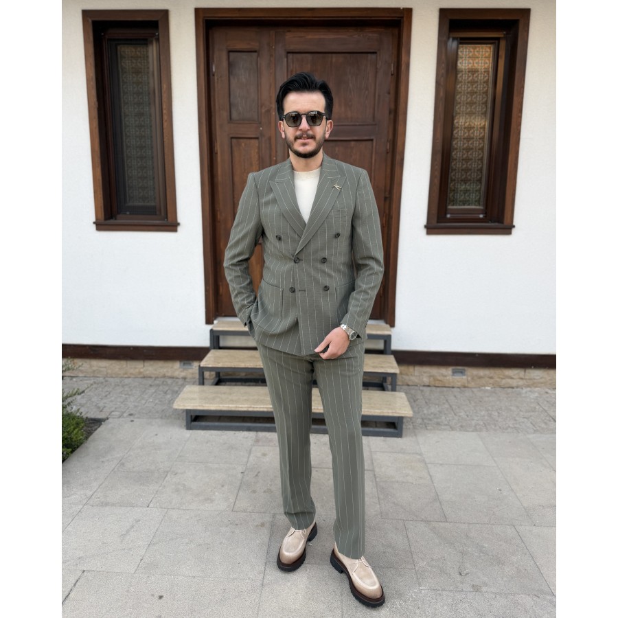 Modern stil anlayışını özgün dokularla buluşturan bu kruvaze takım elbise, gofre (dokulu) kumaş yapısı ve ince çizgili deseniyle dikkat çekici bir şıklık sunar. Hafif kabartmalı yüzeyi sayesinde klasik takımlardan ayrışırken, kruvaze kesimi güçlü ve karizmatik bir duruş kazandırır.