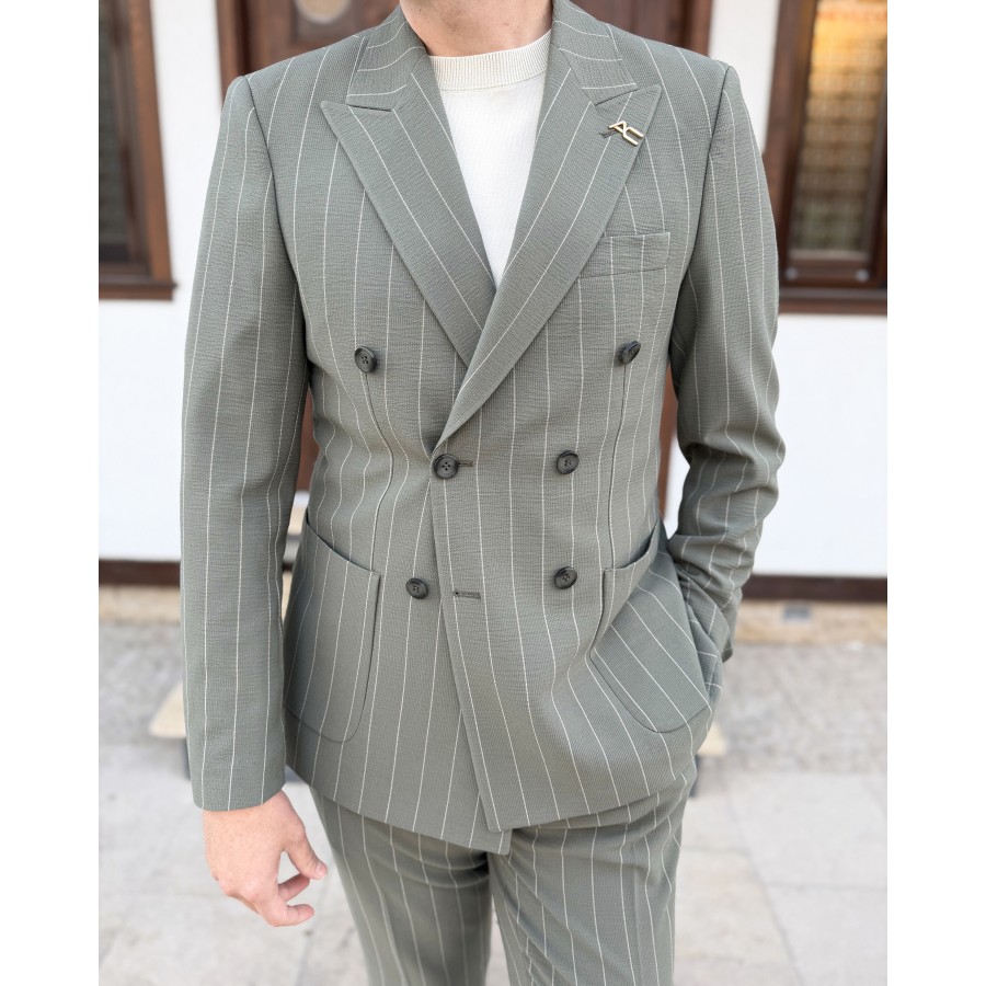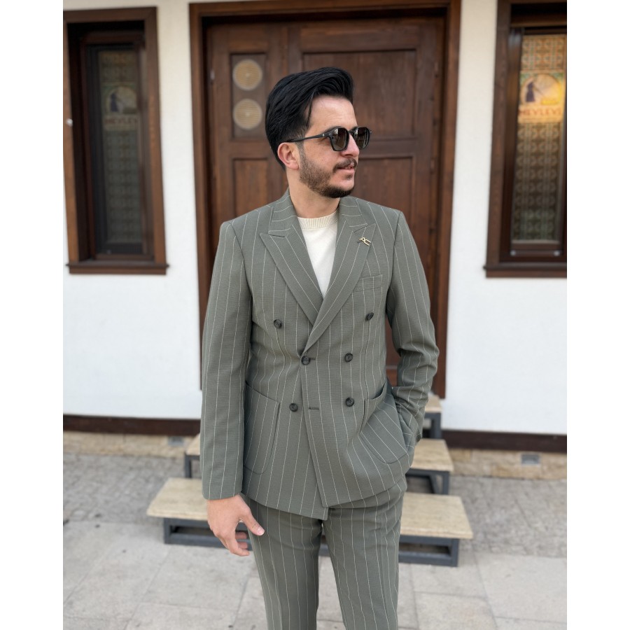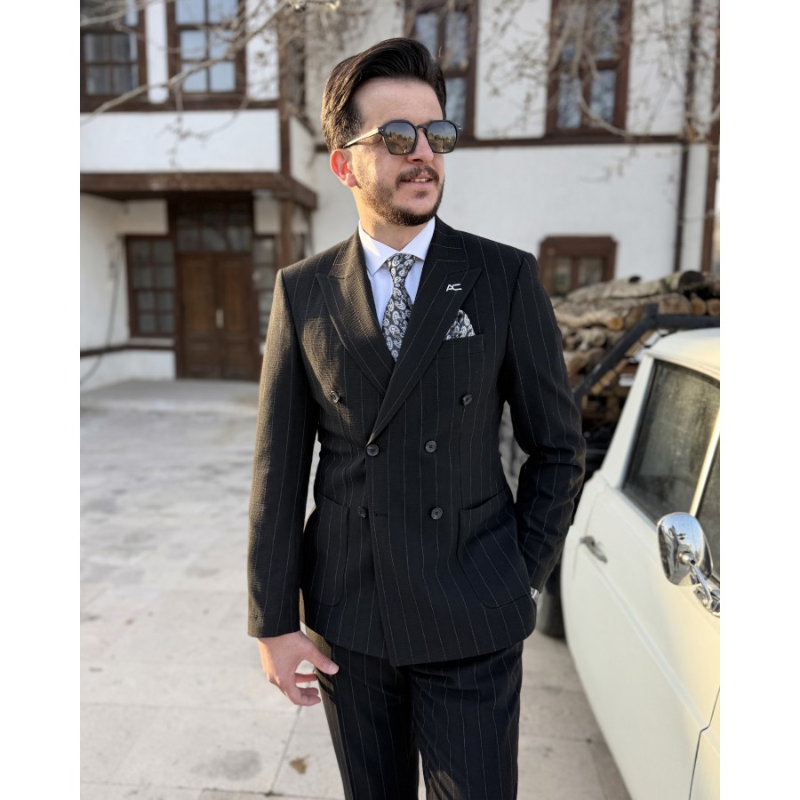 Erkek Modern Çizgili Gofre Kumaş Kruvaze Takım Elbise