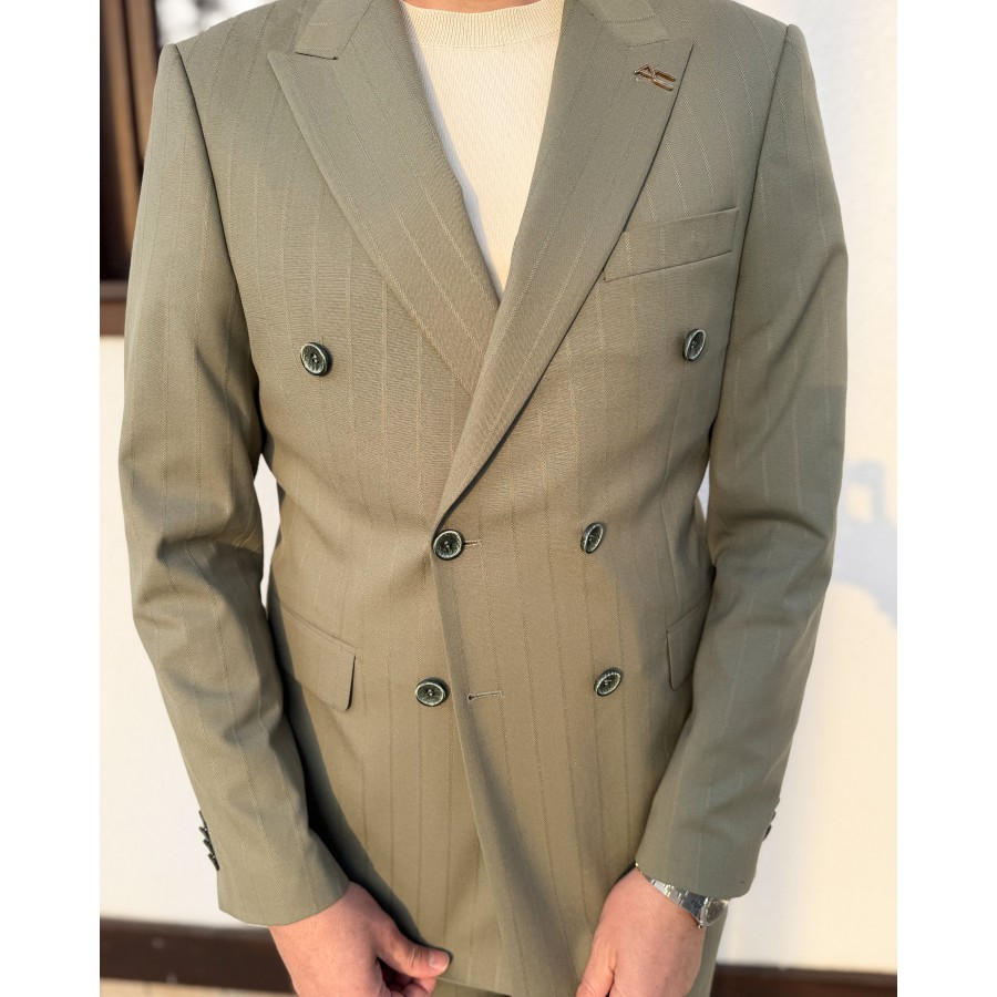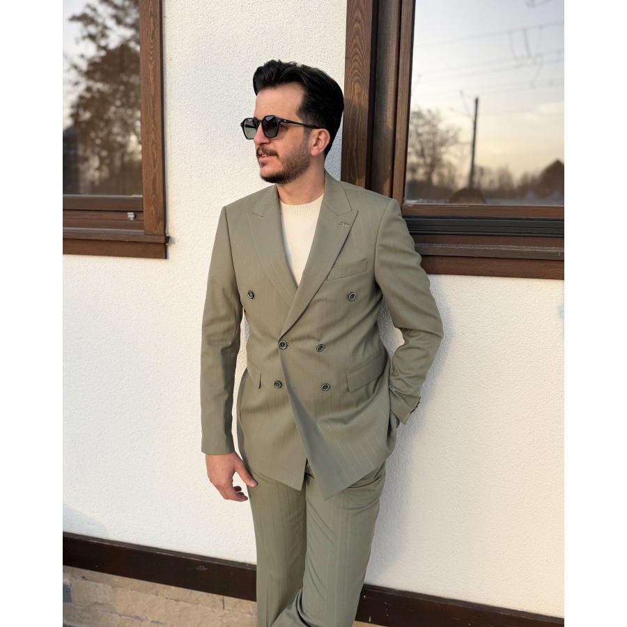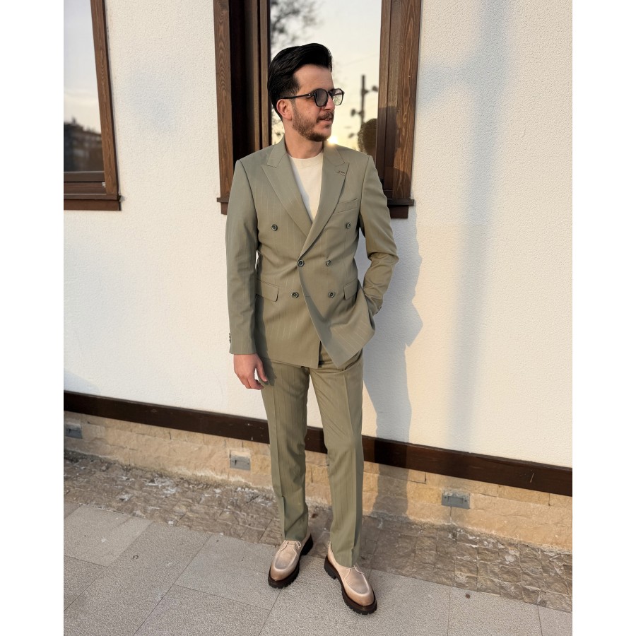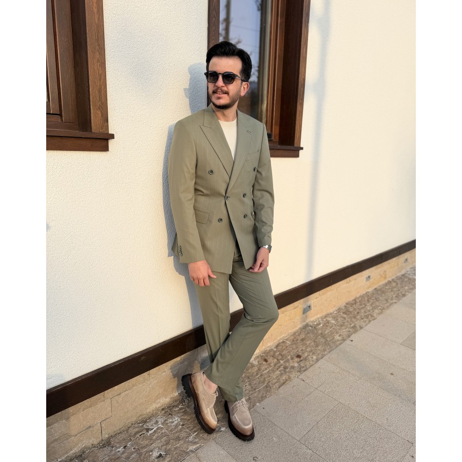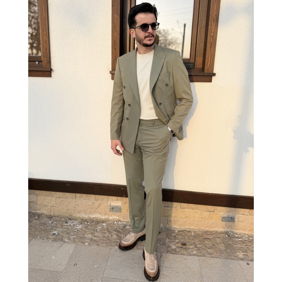 Zarif tonların modern terzilikle buluştuğu bu kruvaze takım elbise, soft olive (açık zeytin yeşili) rengi ve silik çizgili deseniyle sade ama etkileyici bir şıklık sunar. Minimal çizgi geçişleri sayesinde göz yormayan, rafine bir görünüm elde edilirken; kruvaze kesimi güçlü ve karizmatik bir duruş kazandırır.