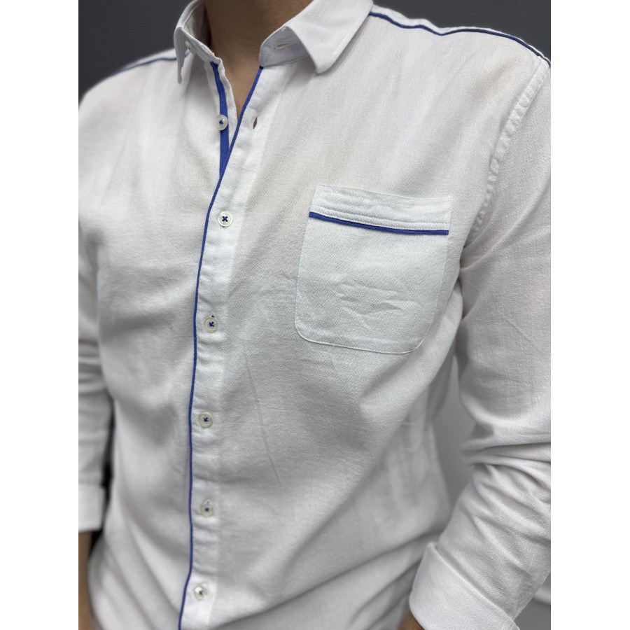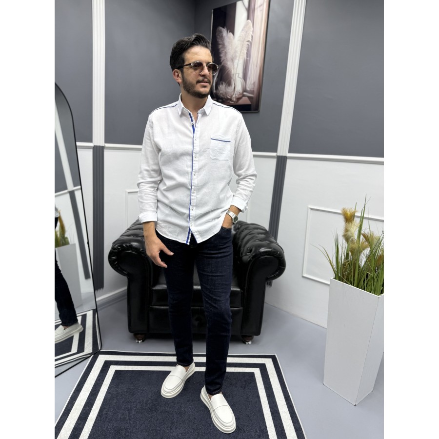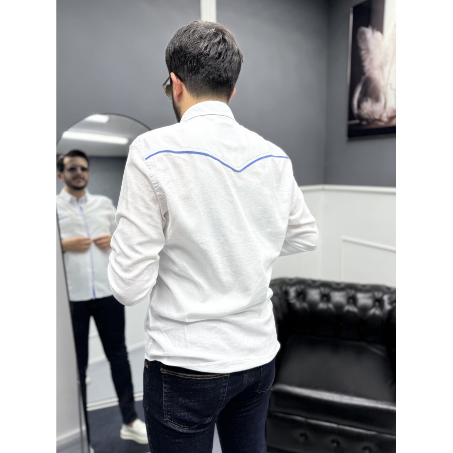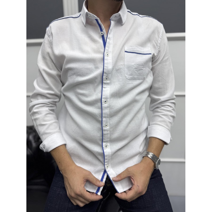 Yaka, omuz, cep ve düğme kenarlarındaki kontrast mavi şerit detaylarıyla klasik beyaz gömleğe modern bir hava katılmıştır. Hem günlük kullanımda hem de smart casual kombinlerde rahatlıkla tercih edilebilir.