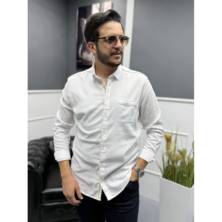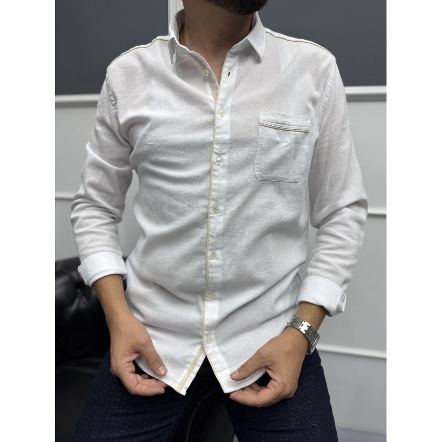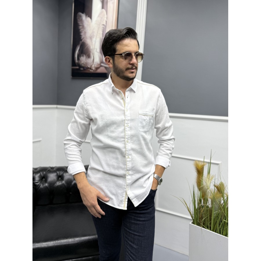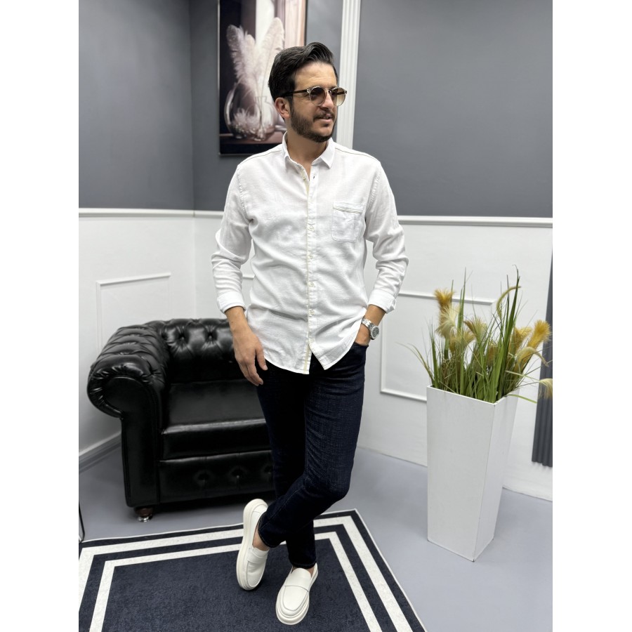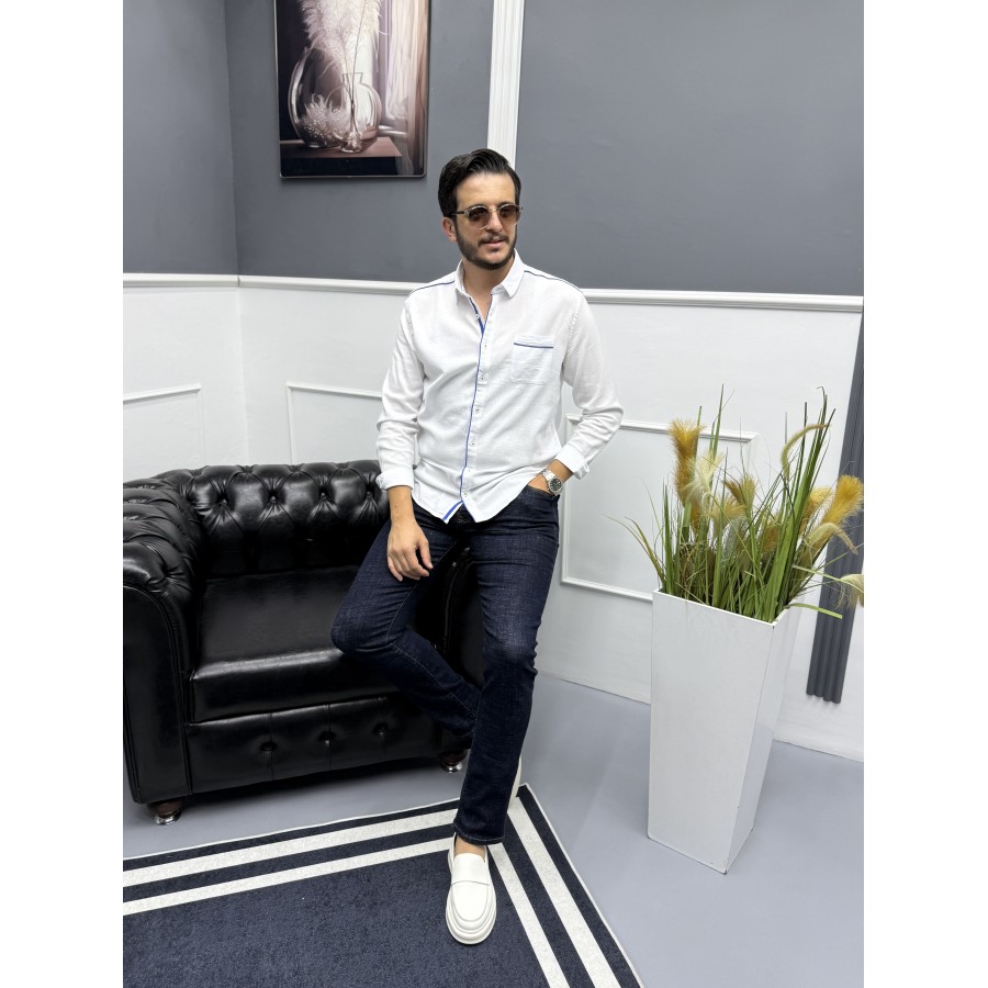 Yaka, omuz, cep ve düğme kenarlarındaki kontrast mavi şerit detaylarıyla klasik beyaz gömleğe modern bir hava katılmıştır. Hem günlük kullanımda hem de smart casual kombinlerde rahatlıkla tercih edilebilir.