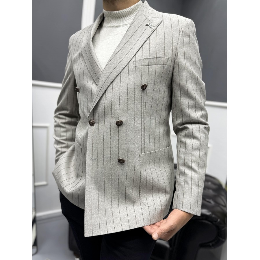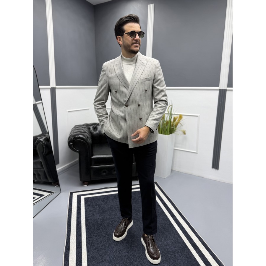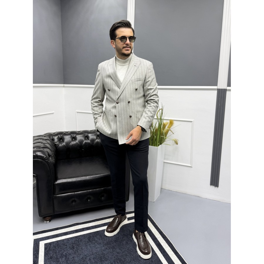 Ürünün kaliteli dokuma kumaşı, sezon geçişlerinde ideal bir kullanım deneyimi sunar. Kumaşın nefes alabilir yapısı ve hafif dokusu sayesinde hem ofis stilinde hem de özel gün kombinlerinde rahatlıkla tercih edilebilir. Çift düğmeli (kruvaze) tasarımı, cekete belirgin bir karakter ve premium bir görünüm kazandırırken, özenle yerleştirilmiş çizgi deseni daha uzun ve fit bir duruş sağlar.